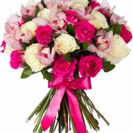 Невероятное сочетание из нежных орхидей бледно-розового цвета, символизирующих элегантность и совершенство, а также ярко-розовых и белых роз, создают букет невероятной красоты, а использование раскуса делают его еще более выразительным и насыщенным. С помощью такой одновременно яркой и трепетной цветочной композиции вы сможете выразить свои теплые чувства к любимой женщине, поздравить друзей, родственников или коллег с праздником, а также получить прощение от дорогого вам человека.