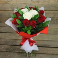 Контрастный, яркий, но очень гармоничный и уравновешенный букет. Белые розы в центр говорят о чистоте чувств и мыслей дарящего. Окружающие их красные розы выражают страсть, сильную любовь и давнюю привязанность. Вся композиция разбавлена декоративной зеленью, которая служит выгодным фоном для цветов.