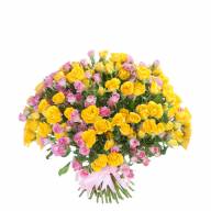 Яркие кустовые розы желтых и розовых цветов смешались в природном танце, даря любому человеку заряд бодрости и позитива. Цвета отлично сочетаются для подарка ребенку на любой праздник, от Нового Года и Первого сентября до Дня Рождения. Взрослые будут счастливы, получить пёстрый букет «Микс» на юбилей, календарный праздник или другое торжество.
